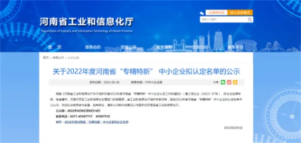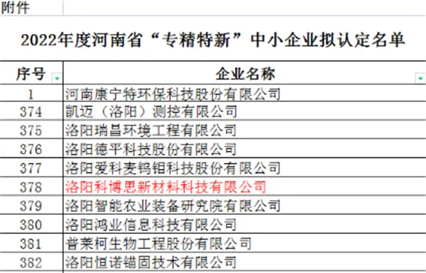 近日,河南省工业和信息化厅公示了2022年度河南省“专精特新”中小企业拟认定名单,sunbet申搏官方网站集团旗下洛阳科博思新材料科技有限公司成功获得河南省“专精特新”中小企业认定。